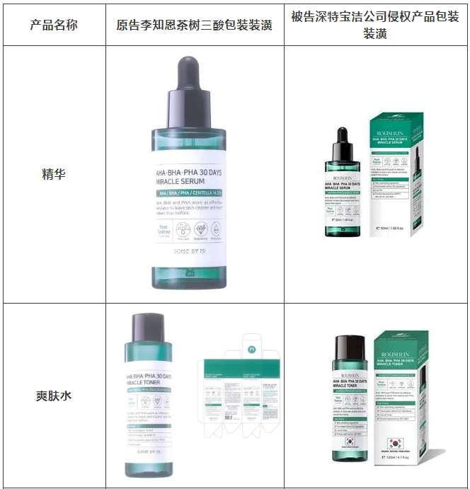 2021年原告委托蜂鸟电竞 调查发现,被告汕头市深特宝洁实业有限公司生产、销售和推广的“茶树祛痘美白补水液”“茶树香皂”等护肤品,其产品包装装潢直接抄袭、摹仿原告前述已经具有较高知名度和影响力的“SOME BY MI/莎柏蜜”茶树三酸系列化妆品和黑蜗牛精华液的包装、装潢设计,使用与之近似的标识,造成消费者混淆误认。故原告作为茶树三酸、黑蜗牛精华包装装潢权益获益人,诉至广东省汕头市中级人民法院。汕头中院认定:李知恩主张的茶树三酸、黑蜗牛精华包装装潢构成具有一定影响的包装装潢,深特宝洁公司生产、销售茶树三酸、黑蜗牛精华液的行为构成不正当竞争。因判赔额不符合原告预期,原告后上诉至广东省高级人民法院,广东省高级人民法院最终维持一审判决。